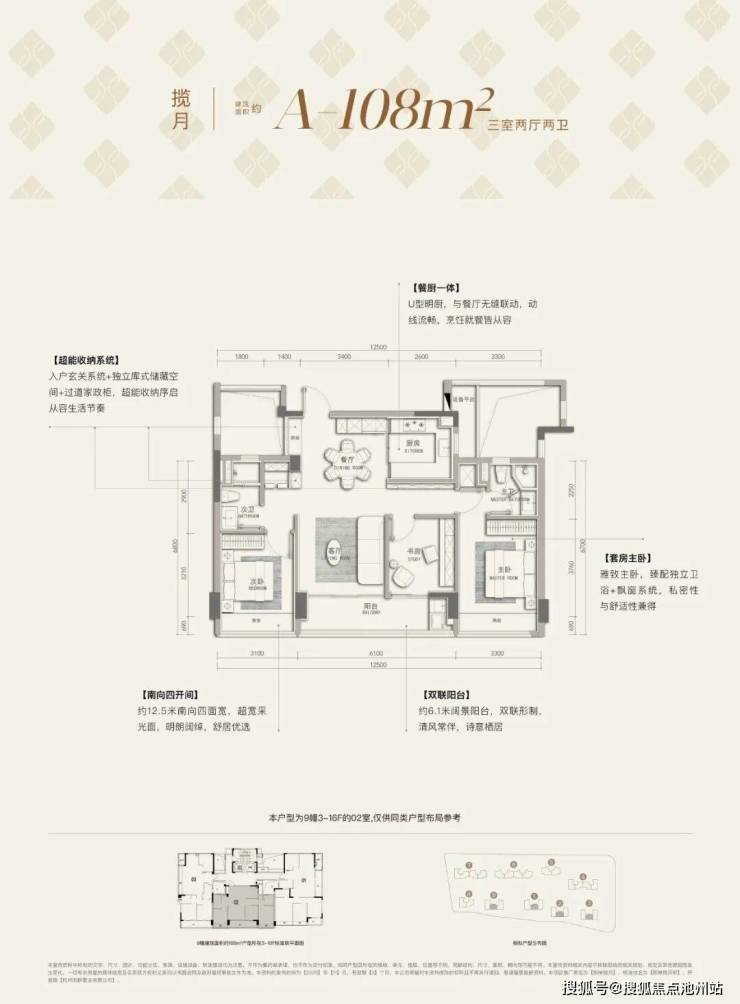 ❺建面约108㎡户型:3房2厅2卫,2梯3户,含赠送得房率约89%左右。