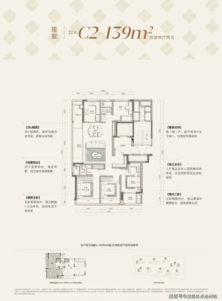 ❸建面约139㎡-C2边厅户型:4房2厅2卫,2梯2户,设有独立电梯厅,含赠送得房率约86%左右。