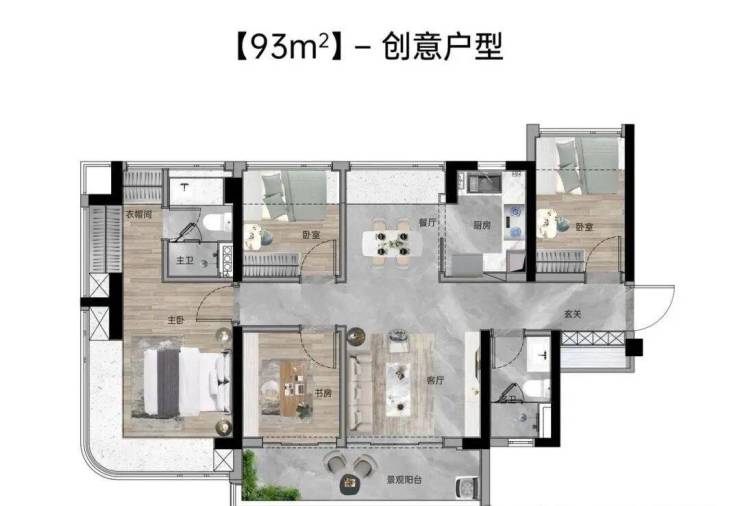 【93㎡四房两厅两卫】:东南向,使用率109%,独立入户玄关,南北通透,四面宽极致视野,主卧270°主卧弧形玻璃幕窗。