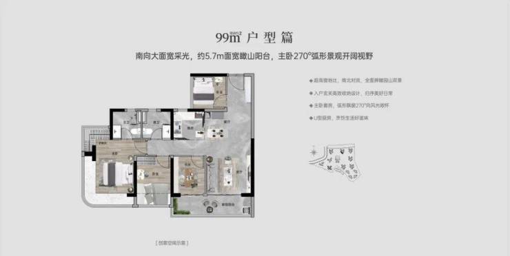 【96㎡四房两厅两卫】:西南向,使用率100%,约5.7米面宽瞰山阳台,主卧270°主卧弧形玻璃幕窗。
