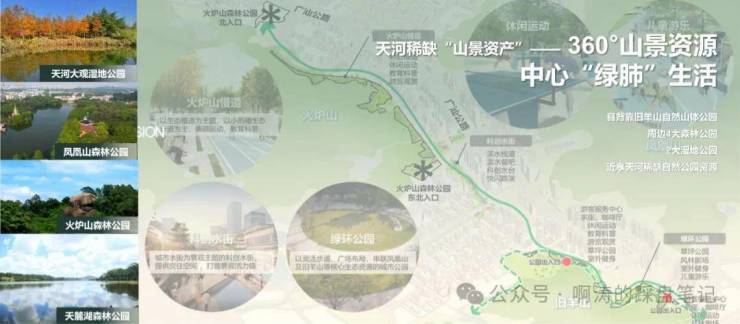火炉山森林公园、凤凰山森林公园、天麓湖森林公园,引山入园,山园相容,打造广府自然家。