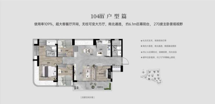 【100㎡四房两厅两卫】:西南向,使用率109%,南北通透,约6.1米巨幕阳台,主卧270°主卧弧形玻璃幕窗。