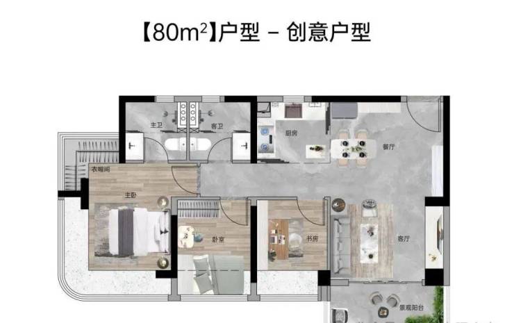 【80㎡三房2厅2卫】:东南向,使用率107%,四开间南向,12.6米超大面宽,主卧270°弧形玻璃幕窗。