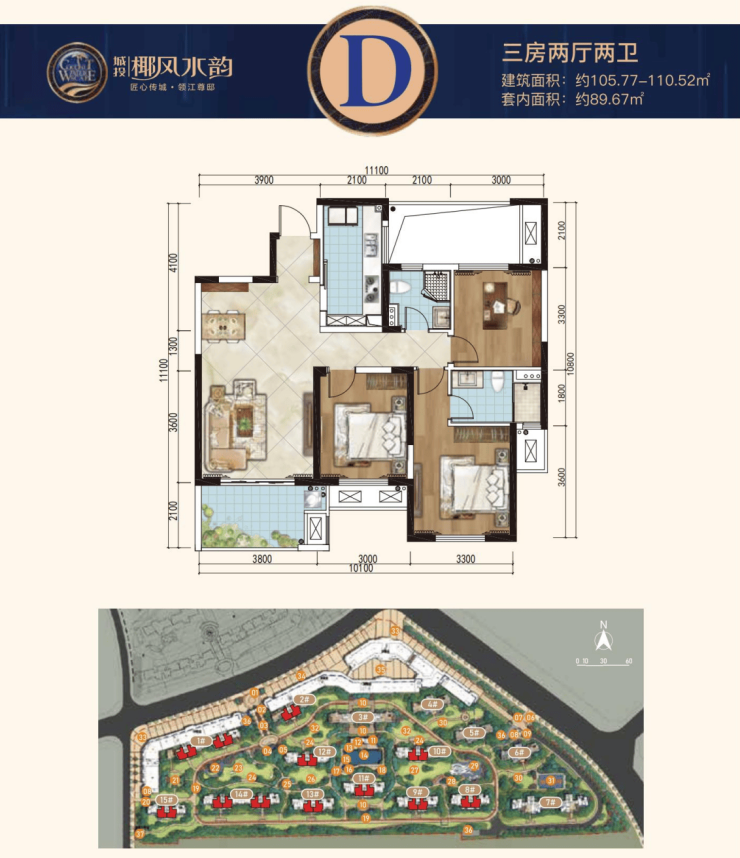 D户型:建面约105.77-110.52㎡三房两厅两卫