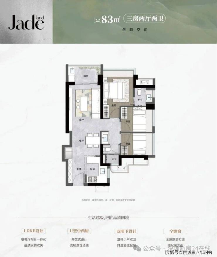 83㎡的3房2厅2卫,设计的是竖厅格局,进门入户玄关,客厅3.2米开间,LDKB一体化,S墙设计预留冰箱卡槽位,U型厨房,主卫少了淋浴,公卫三段式分离,得房率约90.33%(包含赠送),阳台西北朝向。