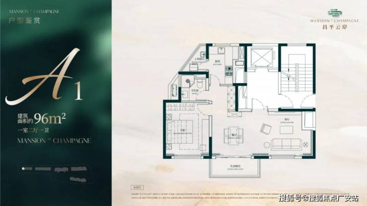建面约96㎡1房2厅1卫户型▼