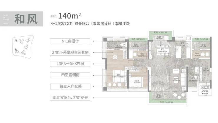 建面140平4+1房,同样四开间朝南,南向采光面达到了15.7米,南北双阳台,LDKB一体化设计,主套配置270度折叠屏飘窗。