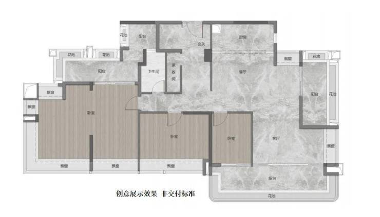 建面116平四房两卫,这个户型没有做板房,相当于138的缩小版,也是超宽阳台和客厅,主卧L型大飘窗,景观也比较好。