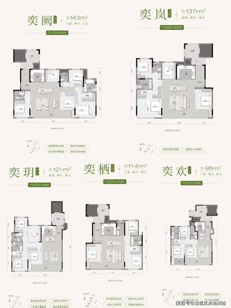 天创-云和奕项目分两期开发,其中一期:5栋11-26层住宅,335户,户均建面116平。一期1#1个单元26层,2、3、4#二个单元都是17层,5#二个单元11层 。都是第四代住宅设计,容积率低,最高得房率约112%,全2T2户配置专梯入户。95-143的面积段都有户型图如下
