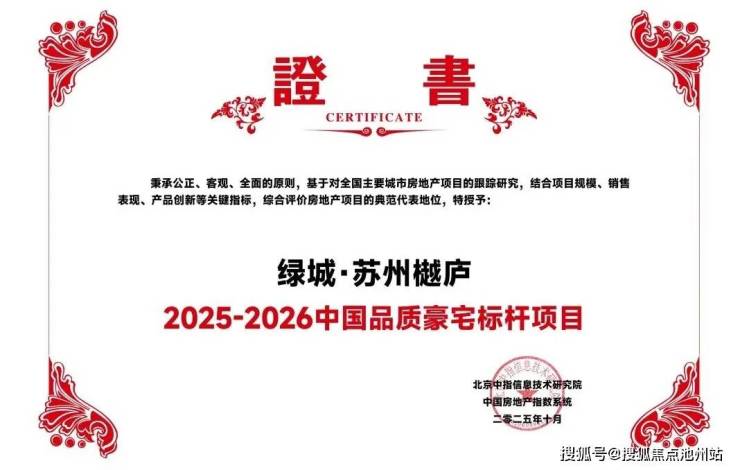 绿城·苏州樾庐凭借在规划理念、产品品质、空间营造与社区运营等方面的综合表现,荣获“2025-2026中国品质豪宅标杆项目”称号。该荣誉不仅体现了项目的高品质,也进一步印证了绿城品牌在高端住宅领域的专业实力与行业地位。