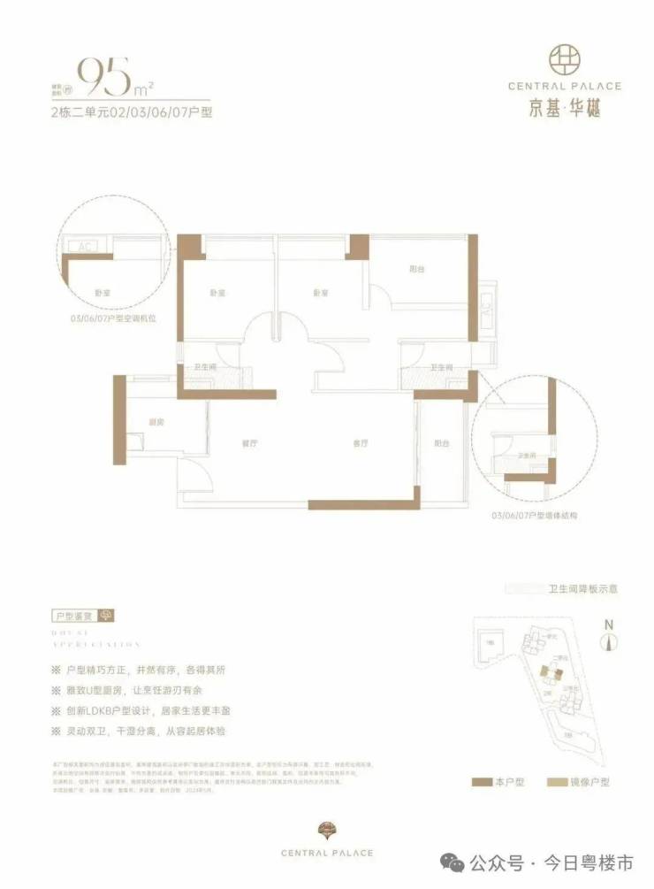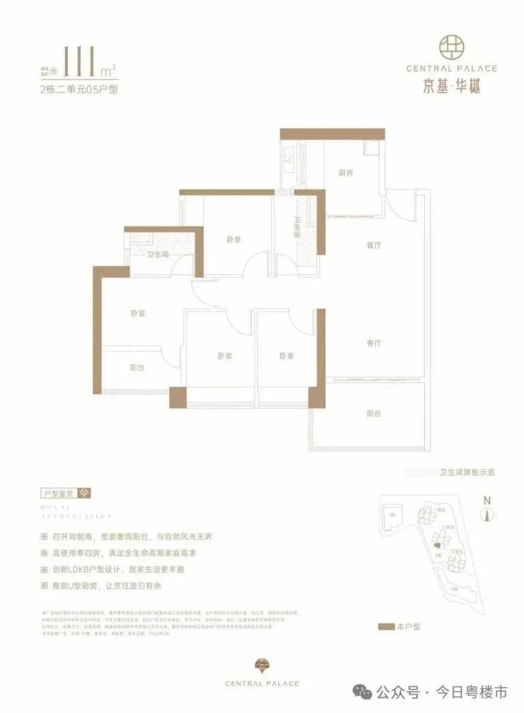 仅2栋2单元05户型才有,设计的是经典竖厅格局,LDKB一体化,动静分区,四开间朝南,U型厨房,卫生间干湿分离,得房率约73%(不含赠送),阳台西南朝向。