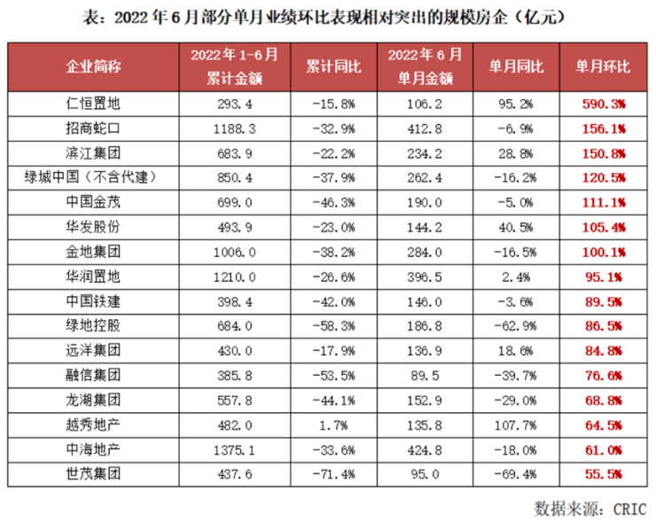 具体来看,6月部分规模房企项目去化情况较佳、单月业绩表现突出,如中海、金茂、远洋、越秀、仁恒等企业单月业绩环比增幅均在60%以上。其中,仁恒位于上海杨浦的仁恒·海上源项目6月末推出372套房源,吸引了近1800组客户参与认购并全部售罄,单项目销售近60亿元。远洋位于深圳一项目认购额近40亿元,去化率达100%。