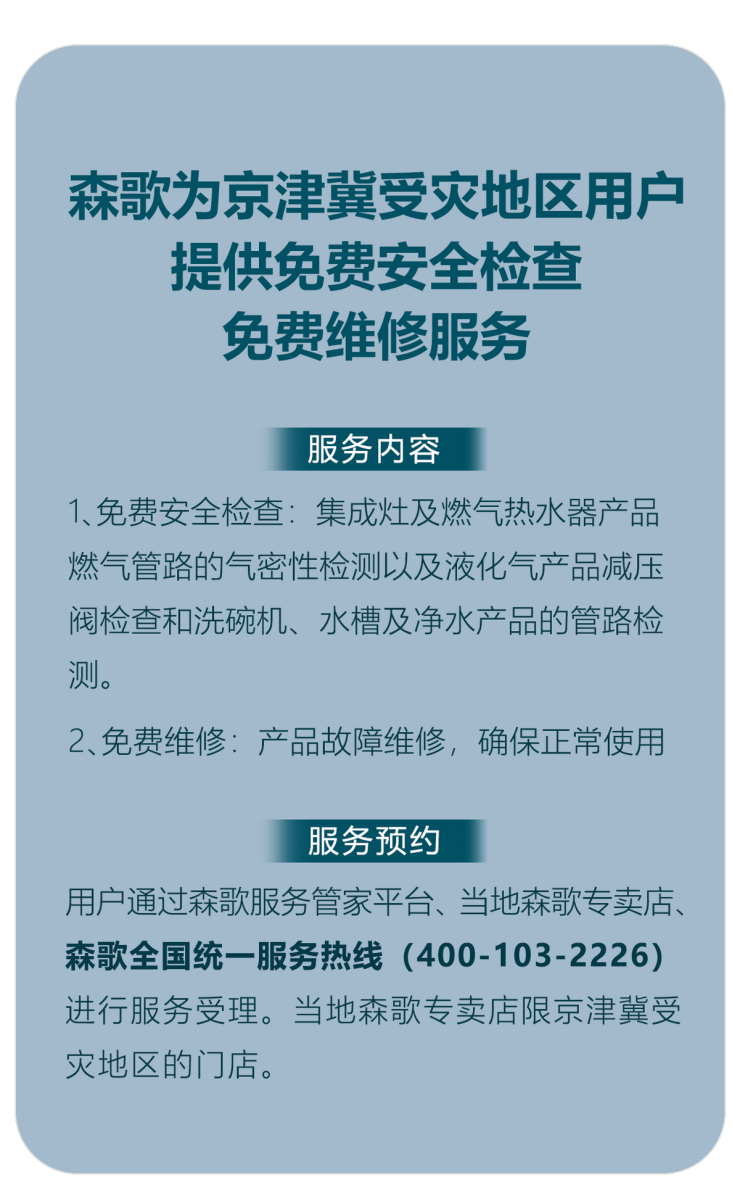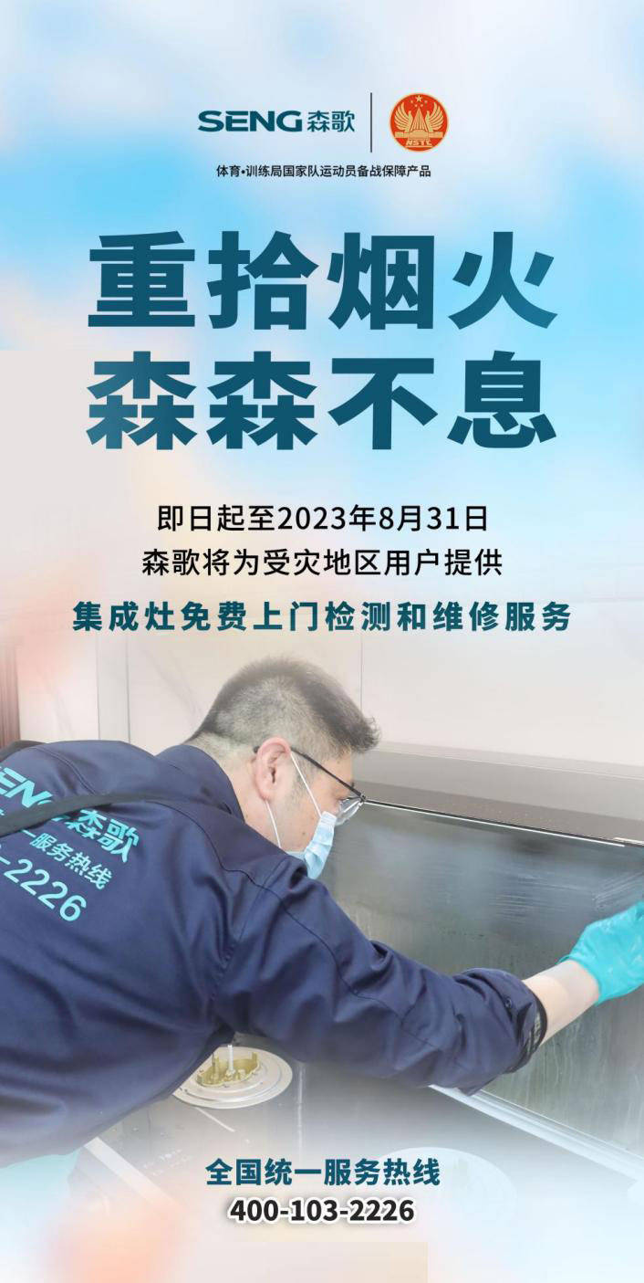 一直以来,森歌秉持“专注品质 专心为你”的服务理念,构建行业领先的服务体系,以全国覆盖的营销网络优势形成了高效响应、极速行动的高端品质服务。此次作为业内率先提出对受灾用户提供免费服务的品牌,森歌将以极致服务力做好模范带头作用,诠释强企担当,彰显企业正能量。