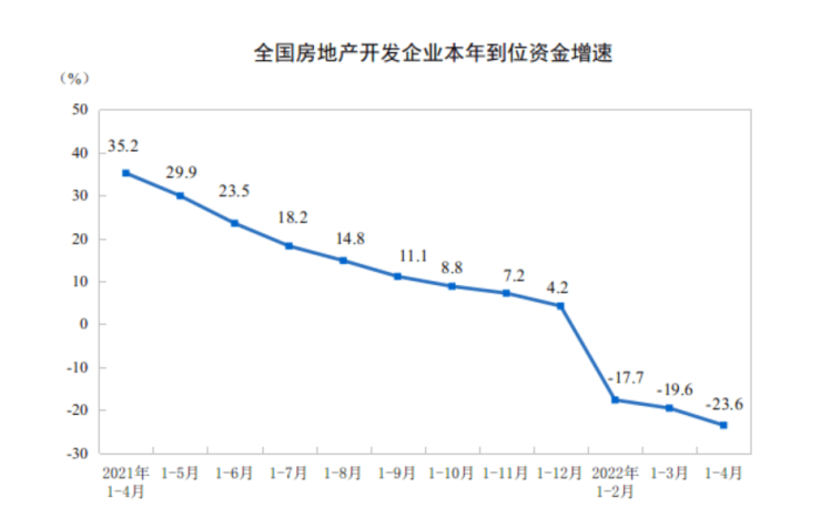 1—4月份,房地产开发企业到位资金48522亿元,同比下降23.6%。其中,国内贷款6837亿元,下降24.4%;利用外资38亿元,增长129.4%;自筹资金16271亿元,下降5.2%;定金及预收款15357亿元,下降37.0%;个人按揭贷款8037亿元,下降25.1%。