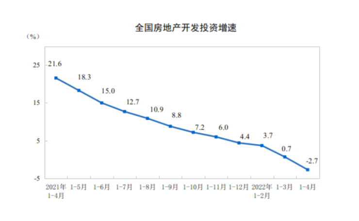 焦点财经讯 耿宸斐 5月16日,据国家统计局消息,2022年1-4月份全国房地产开发投资下降2.7%。