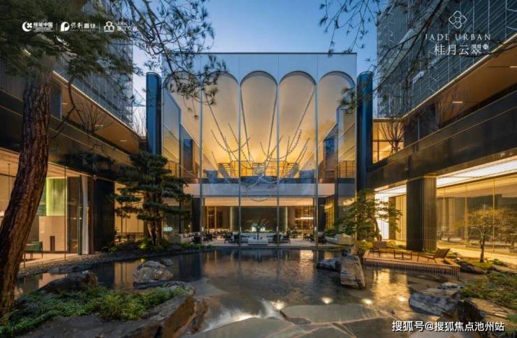 特邀近180年历史日本植弥加藤造园社共创设计,以“千里江山图”为灵感取境,巧妙运用景观高差处理手法打造下沉式庭院,围合一方大美隐于内的“泛会所空间”。