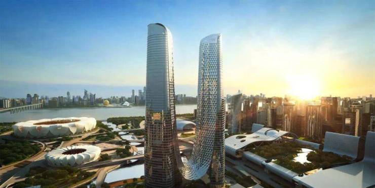 杭州之门双塔朝向远处的钱塘江和利民河,与周边的市民中心、莲花碗、杭州国际博览中心、日月同辉等核心建筑群打造一个“七星拱月”格局。