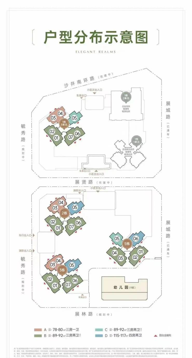招商会展湾雍境名邸,由招商集团打造,总占地面积约2.52万㎡,总建筑面积约16.95万㎡,计容建筑面积约11.76万㎡,容积率4.3,分2个地块开发,共由6栋总高26-31层高的住宅组成,其中1栋1单元公租房26F,1栋2单元自持租赁30F,1栋3单元/2栋住宅31F,3栋/5栋住宅32F,4栋是1所9班制幼儿园。