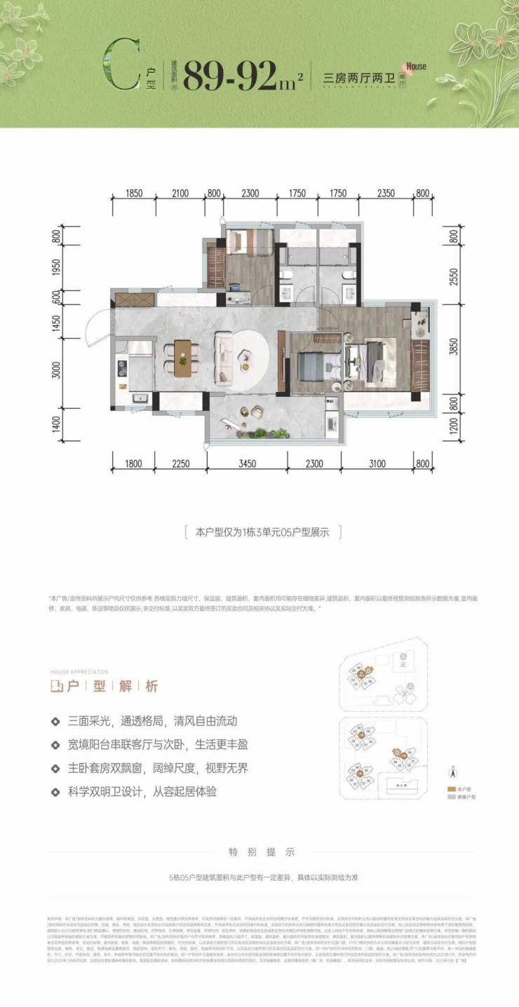 89㎡的3房2厅2卫,C户型,设计的是横厅南北通透格局,进门入户玄关,客餐厅5.7米开间,LDKB一体化设计,主卧套房双飘窗,3个卧室分别做到了主卧18.5㎡/次卧7.7㎡/次卧6.9㎡(包含墙体飘窗),客厅连接次卧出5.75米长的巨幕大阳台,U型厨房,科学双明卫,得房率约102-105%(包含赠送),阳台主朝东南向。