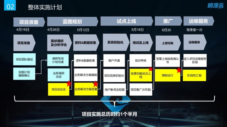 目前已完成整个项目团队的建设计划、业务的调研及高层的访谈,明确计划节点的时间、责任人,以保证项目于6月30日前如期上线。
