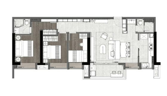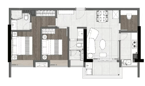 建面115㎡三房两厅两卫,LDKG一体化设计,纯东向横厅设计,公卫三段式分离,最大化提高效率。