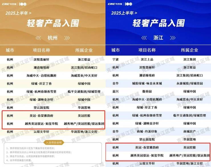 6月11日,克而瑞浙江区域正式揭晓2025半年度产品力榜单,英冠·春棠雅韵府凭借宋韵美学的当代演绎,以及屡开屡罄的硬实力,强势入围浙江/杭州轻奢双榜。(信息来源:克而瑞浙江区域)