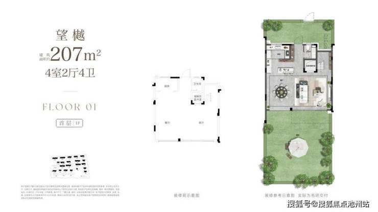 在产品设计上,项目创新实现了大面宽、高「院房比」,拥有极致尺度与通透感。以建面约207㎡四房四卫户型为例,一层客餐厅面宽达约9米(远超杭州上一代排屋约7米的普遍水平)。巨幅落地玻璃取代传统实墙,最大限度引入自然光、清风与庭院景观,实现室内外交融无界。