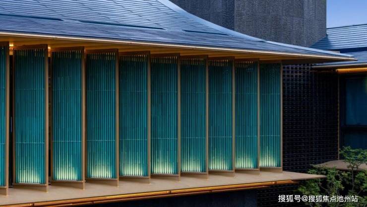 入口处9米长的黑金砂石瀑墙,经匠人千锤百炼手工斧凿,方呈现出“落瀑清音”的意境与依山而建的嶙峋质感;46樘青釉陶瓷屏扇历经多轮窑火淬炼,终得“天青过雨”的秘色瓷韵;屋顶特制靛蓝陶瓦以双倍于小青瓦的成本,在阳光下流淌出《千里江山图》的青绿幻境。