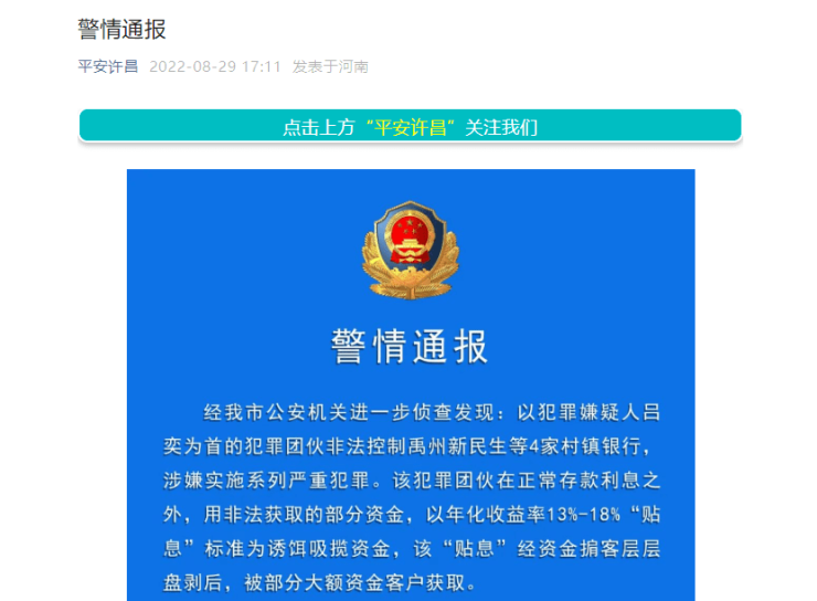焦点财经讯 李泳青 8月29日,河南许昌警方通报“村镇银行案”进展。
