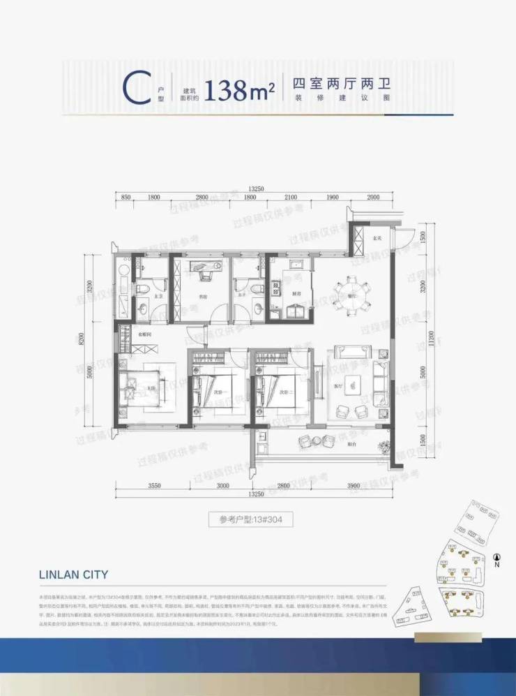 建面约138方户型:138㎡四房两厅两卫边套户型,则适合改善家庭的需求。空间格局动静分区,三个南向卧室,做到了「阳光平权」。卧室与客厅一同实现了四开间朝南,南向面宽超13米,同样也规划有双开间的「跑道阳台」。