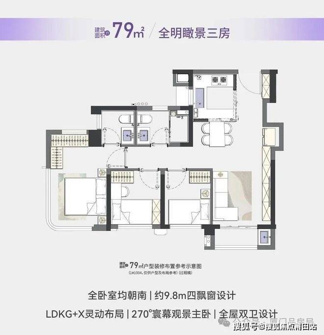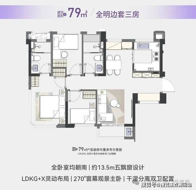 79㎡边套三房两卫则是本次首开的爆款,225万起的价格,堪称“性价比之王”。这款户型做到了真正的南北通透,穿堂风让室内时刻保持干爽;三房两卫的全功能配置,满足三口之家甚至二胎家庭的需求,边套还配备3-4段式干湿分离卫浴,实用性拉满。很多购房者看完样板房都惊叹,这个户型的空间利用率远超预期,比市面上同面积户型多一个卫生间,相当于直接省下10㎡的购房成本,这笔账怎么算都划算。