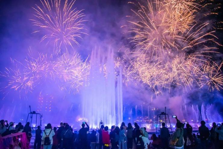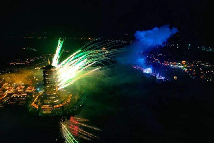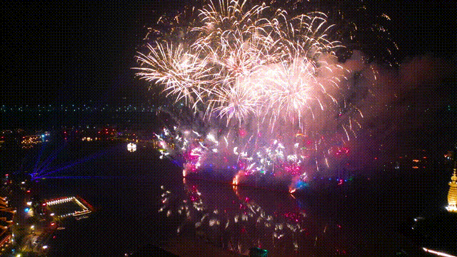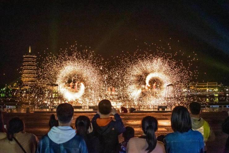 非遗绝技火龙钢花此次从以前的三个的点位升级为五个,更加密集的铁花如火雨般飞洒。激光焰火水舞秀也迎来隆重升级,石渚塔上每一层都添加了燃放点位,伴随着音乐从高塔上喷射而出,在空中划出一道亮丽的弧线!
