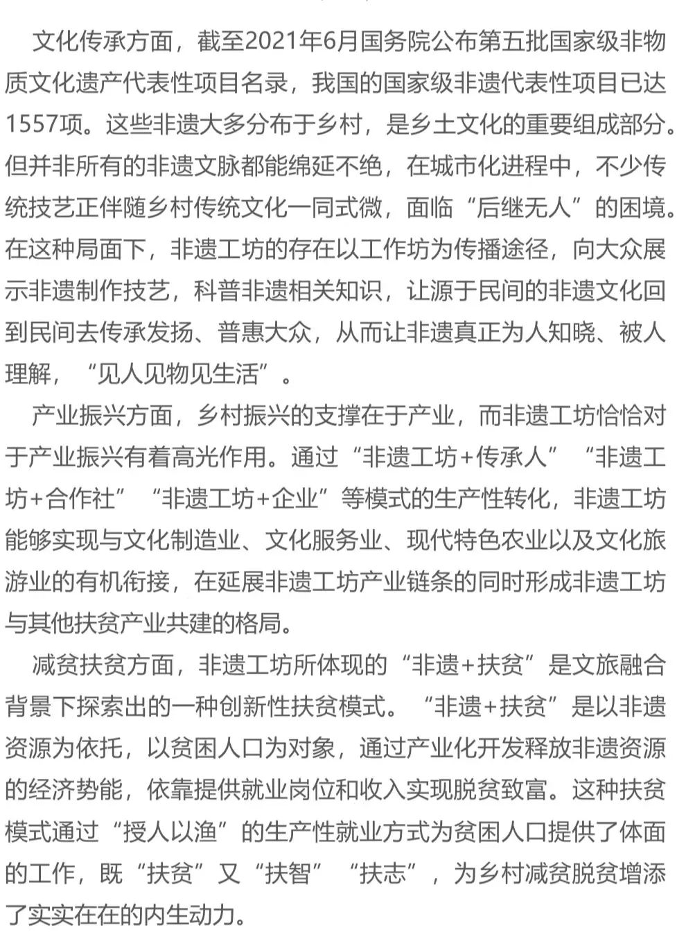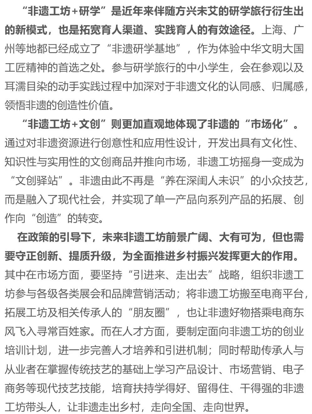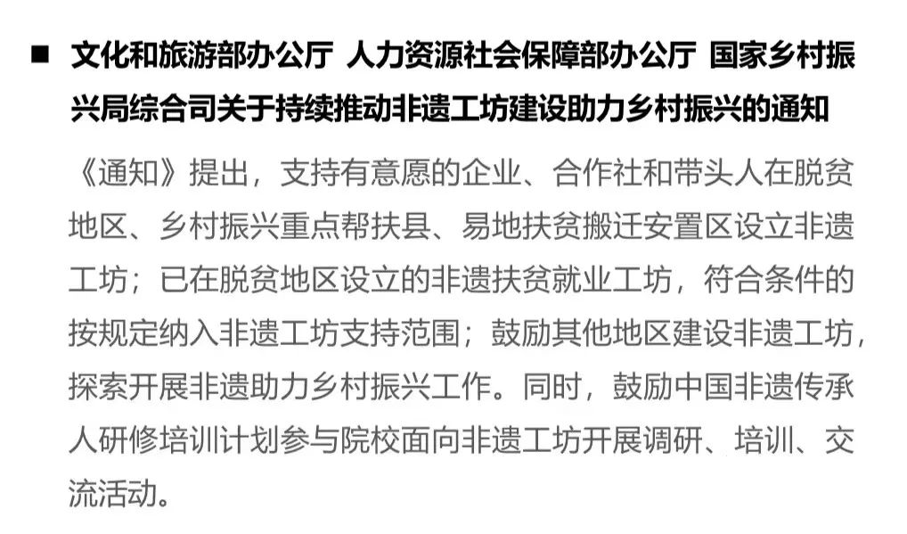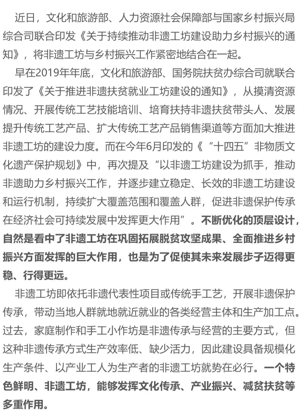 本周,文化和旅游部、人力资源社会保障部与国家乡村振兴局综合司联合印发《关于持续推动非遗工坊建设助力乡村振兴的通知》。《通知》中提出,支持有意愿的企业、合作社和带头人在脱贫地区、乡村振兴重点帮扶县、易地扶贫搬迁安置区设立非遗工坊,这就将非遗工坊与乡村振兴工作紧密地结合在一起。在政策的引导下,未来非遗工坊前景广阔、大有可为。