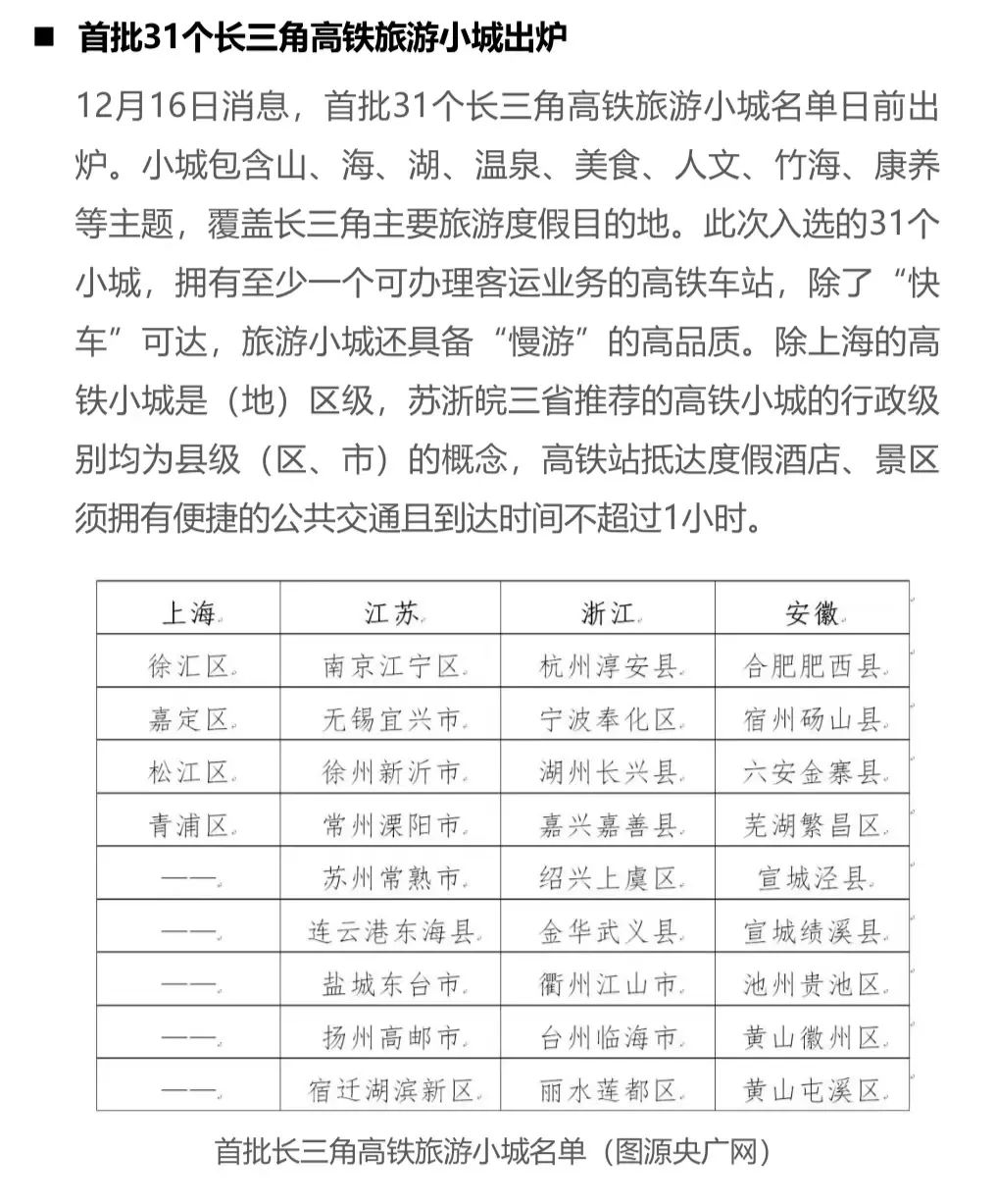 本周,首批31个长三角高铁旅游小城名单出炉。31个高铁旅游小城包含山、海、湖、温泉、美食、人文、竹海、康养等主题,具有快进慢游、宜游宜居的鲜明特点。周边短途游时代,这些高铁旅游小城将成为长三角地区重要的旅游度假目的地。