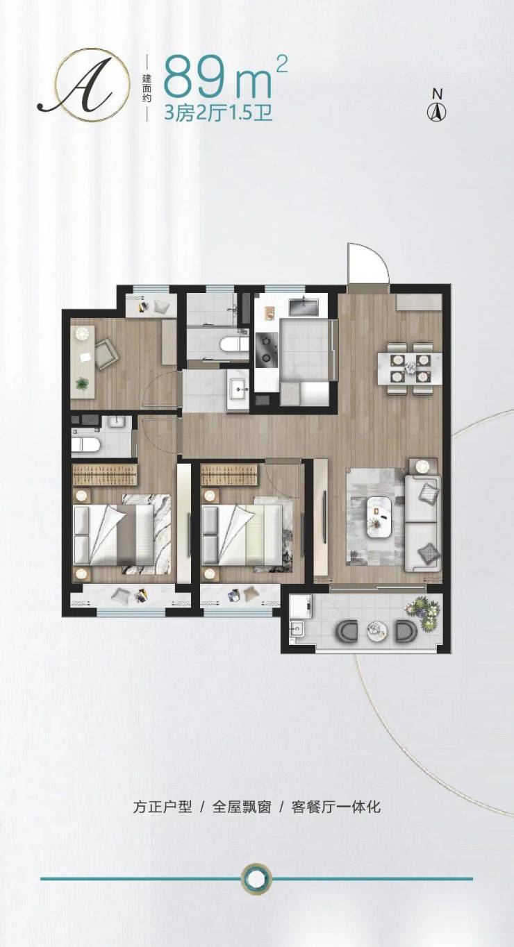 建面约89㎡做3房,功能性上就占尽先机,没想到项目还有1.5卫配置,主卧升级套房,真正实现一步到位!
