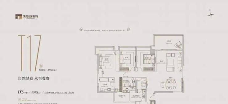 有172㎡、195㎡等多种面积。其中,172㎡的三房分布在t10、t26栋的3-9层,2梯3-4户,有三房两卫;195㎡的三房在t17栋的3-26层,2梯4户,有三房两卫。LDKB 一体化会客厅,朋友聚会超有面儿。