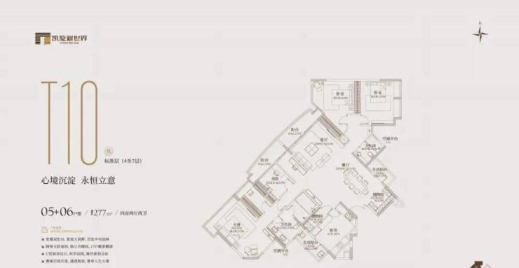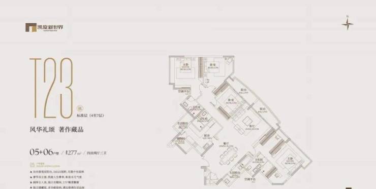 有254㎡、277㎡等面积。254㎡的三房分布在t10、t23、t26栋的3-9层,2梯3户,有三房三卫;277㎡的四房分布在t10、t23、t26栋的3-8层,2梯3户,有四房两卫或三卫。