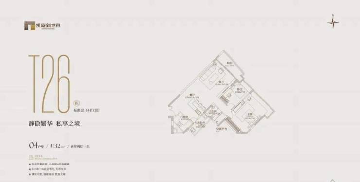 🏠户型超惊艳:从 132㎡精致两房起步,开启奢居体验,分布在t10、t26栋的3-9层,2梯3-4户,有两房一卫。
