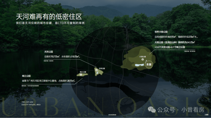 天河第三片绿洲,大观公园:公园用地面积约15万方,加上周边山林面积达到243万方,相当3.5个天河公园,8.6个珠江公园