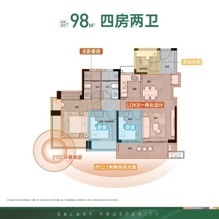 1-零公摊设计:LDKG一体化+双卫配置+主卧270°飘窗