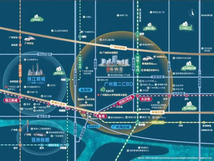 项目地处“珠-金-琶”珠江黄金8公里内,在广州第二 CBD,崛起“下一座珠江新城”,第二CBD占地面积达59平方公里,相当于10个珠江新城,西承天河两大CBD-珠江新城、金融城,北连科学城、黄埔区府,南接琶洲、鱼珠,东至穗港深黄金走廊。由国际金融城、临港经济区、琶洲形成黄金三角区,是广州发展前景最为广阔的区域,具有无与伦比的地段价值。