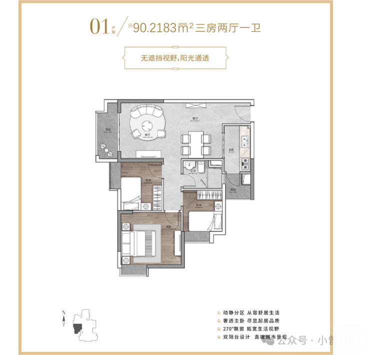 三口之家可以看看 90㎡的 3 室 2 厅,总价约 328 万元,布局很规整,厨房是 U 型设计,预留了冰箱位置,次卧面积刚好能放下儿童床,公卫做了干湿分离,日常使用互不干扰。