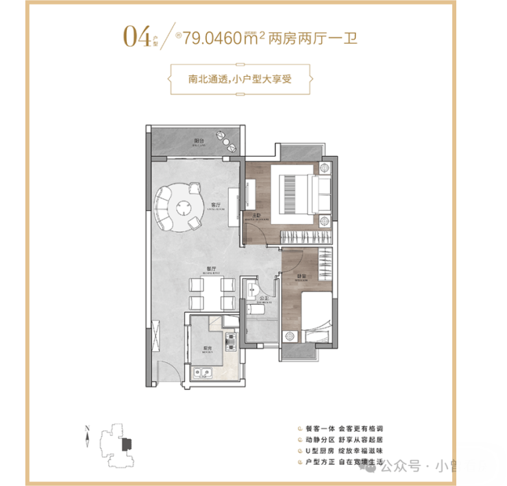 79㎡的 2 室 1 厅是刚需热门,总价大概 300 万元,得房率能到 82%,主卧带 270° 转角飘窗,采光不错,南向的朝向也让房间冬天更暖和,客厅和卧室的空间分配比较均衡,不会显得局促。