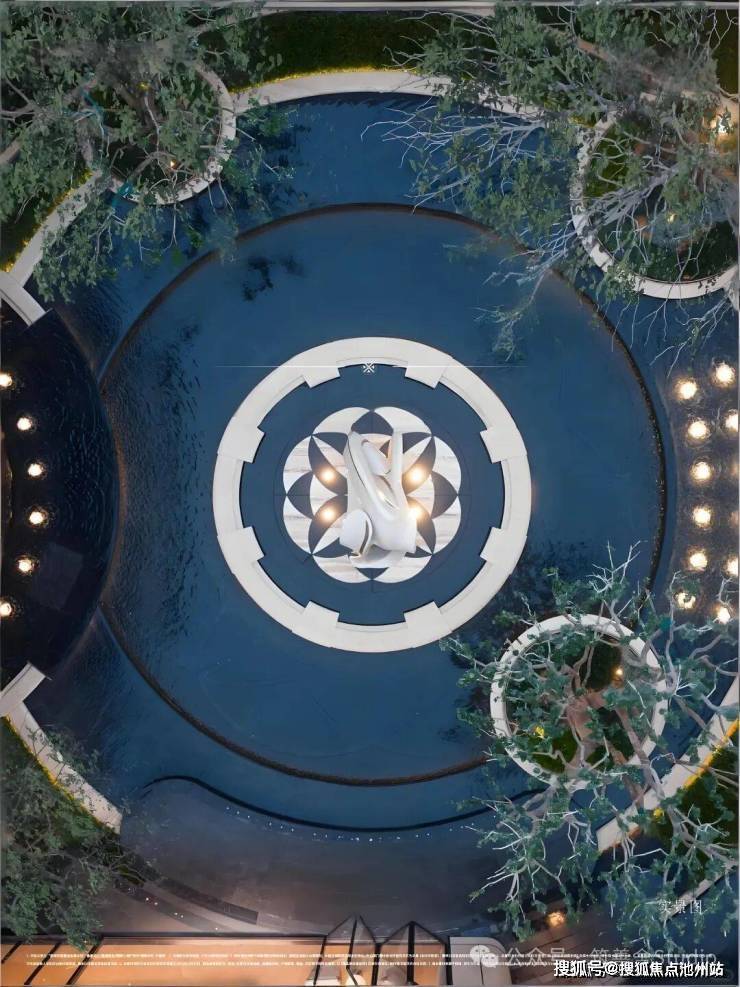 下沉式庭院以“泗水归堂”的围合设计,巧妙汇聚四方之水,寓意“聚财纳福”。晴日水光流金,雨天波光洒银,景致变幻万千。庭院四周百年老树与乌桕成荫,绿意盎然。中央“瓯曜门庭”主题雕塑,演绎“水绕玉环,漪生珮响”的意境,形藏风聚气。池底奢石采用幻影蓝,与巴黎丽兹酒店同款的蓝钻奢石相映成辉,皆为自然孤品。地形还原“错落水景”等自然地貌,呈现“水光晃动,曲水流觞”的立体动态美感,视觉震撼。