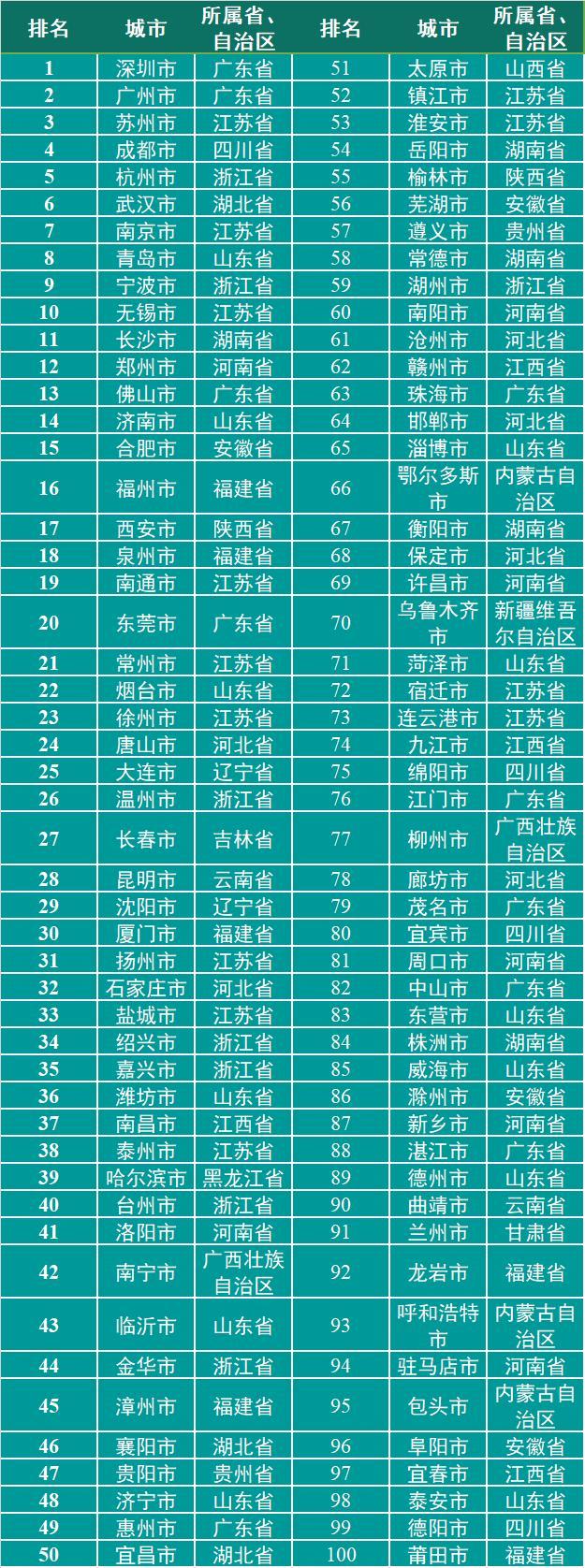 赛迪顾问从国内293个地级市中评选出了2021年的百强市,结果如下: