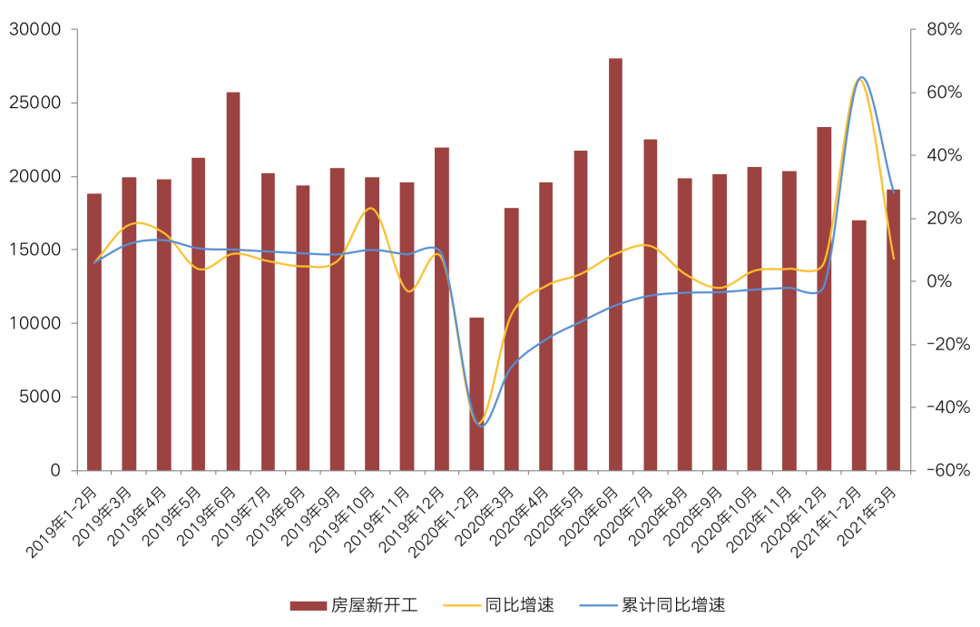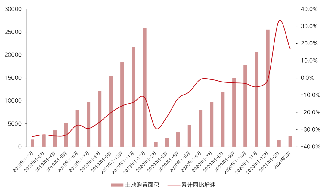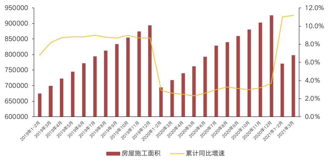 预计2021年全年房企拿地投资态度都保持谨慎态度,土地购置面积或将持续走弱,势必将制约新开工面积上行空间,但由于企业抢回款诉求强烈,施工面积仍将保持较快增长态势,年内房地产开发投资增速有望保持两位数以上的高增长。