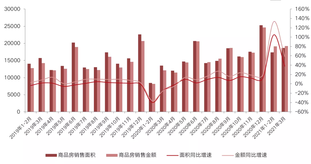 一季度,房地产市场热度不减,成交超预期表现。商品房销售面积36007万平方米,同比增长63.8%,较2019年一季度增长20.7%。商品房销售额实现38378亿元,同比增长88.5%,较2019年一季度增长41.9%。