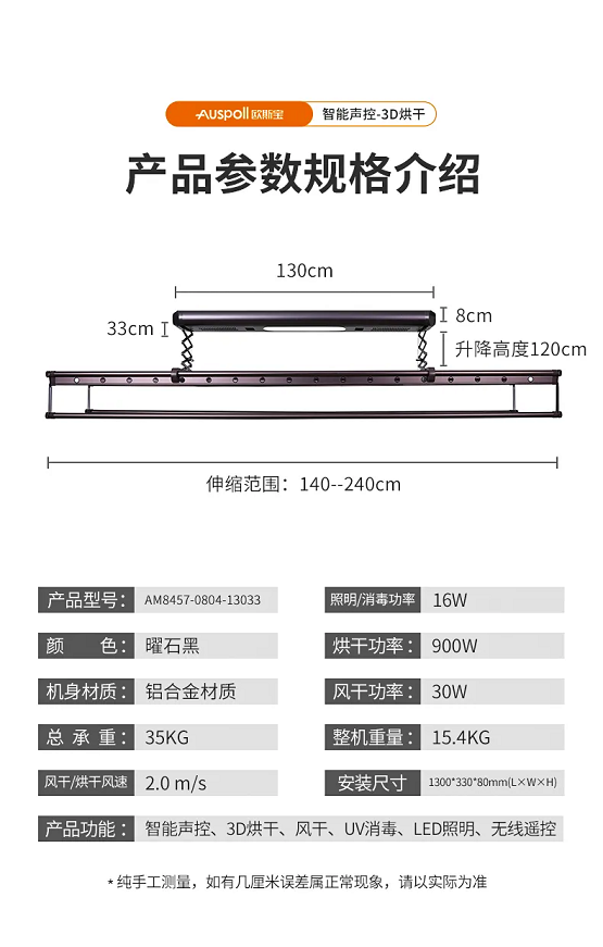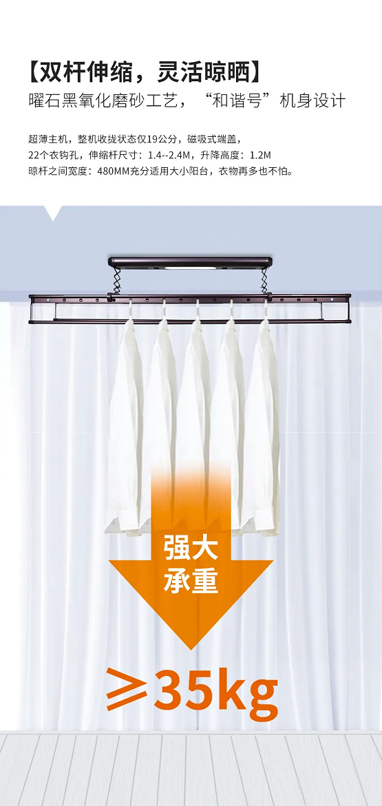超薄主机,整机收拢状态仅19公分,磁吸式端盖,22个衣钩孔,较高承重35kg,双杆灵活伸缩,伸缩杆尺寸:1.4--2.4m,升降高度:1.2m,晾杆之间宽度:480mm充分适用大小阳台,同样空间晾的更多,衣物再多也不怕。