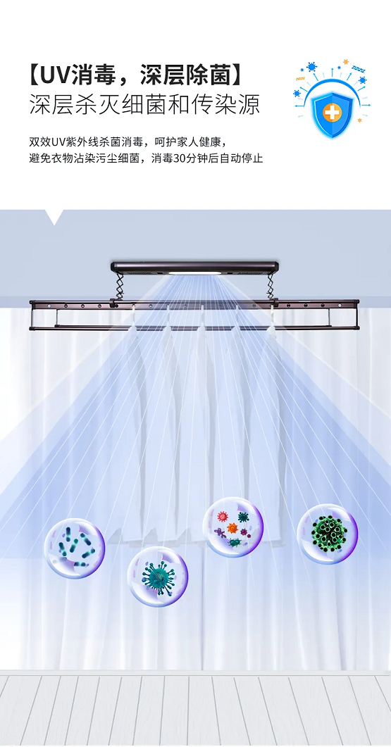 双效UV紫外线杀菌消毒,深层除菌,呵护家人健康,避免衣物沾染污尘细菌,深层杀灭细菌和传染源,消毒30分钟后自动停止,赶走细菌危害,守护全家健康。