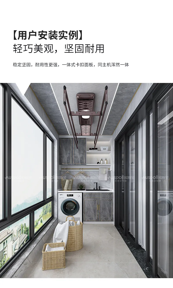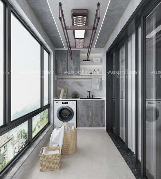 阳台主要起到晾晒衣物的作用,但随着生活指数的不断提高,人们对家居的整体装修越来越重视,任何一个区域既能实现基础功能同时又极具观感,实现空间运用较大化。欧斯宝用心打造整体阳台设计方案,智能晾衣架成家居阳台必备单品,“智”美呈现,一键解决晾晒烦恼!